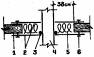 1 — потолок. 2 — верхнее и нижнее металлические кольца (кровельная сталь), 3 — уплотнительный асбестовый шнур, 4 — вытяжная труба (сталь), 5 — минераловата, 6 — гвозди. Расстояние «от дыма до дерева» принимается 38 см.