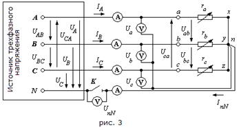 измеряется вольтметром электромагнитной системы с пределом измерения 150 В. Токи в фазах потребителя и ток в нейтральном проводе измеряются амперметрами электромагнитной системы с пределом измерения 7,5 и 5 А. Однополюсной вы-ключатель К в цепи нейтрального провода позволяет исследовать режимы работы трехфазной трехпроводной системы (выключатель К отключен) и режимы трехфазной четырехпроводной системы (выключатель К включен). Сопротивления проводов, соединяющих источник и при-емник, в лабораторных условиях могут быть приняты равными нулю. При этом линейные напря-жения на зажимах потребителя , , по величине становятся равными линейным напря-жениям источника и образуют в совокупности симметричную трехфазную систему с действу-ющим значением 220 В.