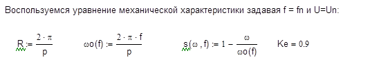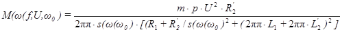 =2f/p– угловая скорость магнитного поля при данной частоте f; р – число пар полюсов; m – число фаз, для трехфазного двигателя m =3; U – текущее значение фазного напряжения; R1 и R2’ – активные сопротивления, а L1 и L2’ – индуктивности первичной и вторичной (приведенной к первичной) обмоток.