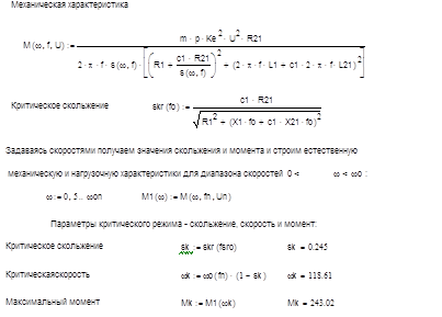 С помощью формулы для момента асинхронной машины строим естественную механическую характеристику привода для номинальных значений напряжения и частоты. На этом же графике строится нагрузочная характеристика механизма.