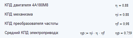 Средний КПД электропривода определяется как произведение КПД двигателя, преобразователя частоты и исполнительного механизма: ср
