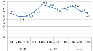 В работе была проанализирована динамика занятости и безработицы в РФ за период с начала 2008 года по третий квартал 2010 года; анализ проводился по данным Министерства экономического развития РФ «Об итогах социально-экономического развития РФ» за 2008, 2009 годы, а также по итогам 3 квартала 2010 года.