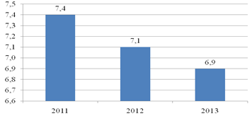 Рисунок 4. Динамика прогнозируемого уровня безработицы в процентах к экономически активному населению в период с 2011 по 2013 года (вариант 2b)