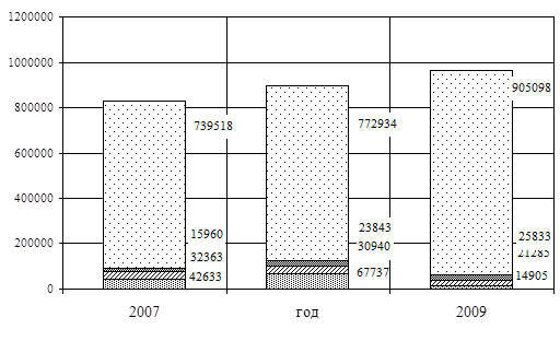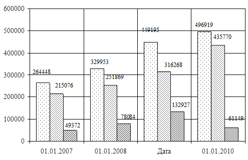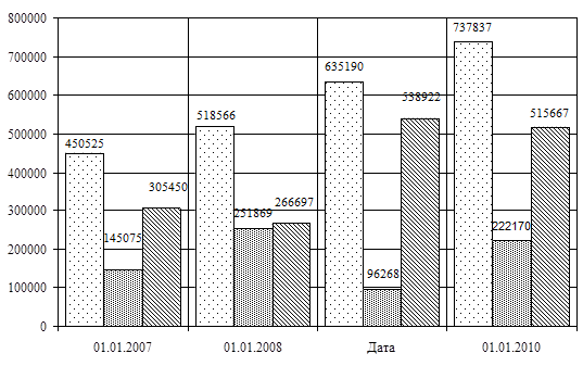 Анализ данных приведенных на диаграмме показывает, что величина чистых активов существенно увеличилась с 305450 тыс. р. в 2007 г. до 515657 тыс. р. в 2009 г. Это можно объяснить ростом величины активов в расчетах 450525 тыс. р. на дату 01.01.2008 г. до 737837 тыс. р. на дату 01.01.2009 г.