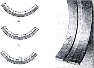 Основными видами отказов тонкостенных вкладышей подшипников СОД являются: износ антифрикционного слоя, задиры и потеря натяга. Анализ технического состояния заменяемых вкладышей рамовых и мотылевых подшипников главных и вспомогательных дизелей показывает, что в 90 % случаев причинами их отказов являются различные виды изнашивания антифрикционных слоев: абразивное, гидроэрозионное, усталостное и др. Кроме износа, который возникает в результате трения, антифрикционный слой раз рушается под воздействием знакопеременных циклических нагрузок, кавитационного воздействия масла.