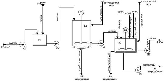 Пастеризованное молоко из ПОУ подается в количестве 300 кг/ч в сепаратор нормализатор СН насосом Н4, где путем разведения сливками нормализуется до положенной жирности. Уровень в сепараторе нормализаторе СН - 0,6 м. Нормализованное молоко насосом Н5 подается в емкость Е2 на временное хранение. В рубашку емкости Е2 подается вода с температурой 4 - 6о С для охлаждения. Кислотность в Е2 не должна превышать 21 - 22 °C. В сыро изготовитель СИ молоко подается в количестве 300 кг/ч насосом Н6. В СИ молоко подогревается до температуры 31 - 34о С горячей воды из заводской сети. Уровень в СИ - 0,6 м. В молоко в СИ добавляется бактериальная закваска, хлористый кальций и сычужный фермент. Смесь перемешивается мешалкой. В результате перемешивания получают сырное зерно, которое насосом Н8 откачивается на дальнейшее формирование в формовочный аппарат ФА. Сычужное свертывание осуществляется при температуре 34о С и рН 5,8 - 6,3. (Савельев А.А., Сорокин М.Ю., Шнейдер Л.К., Крышин А.Т., 2002.).