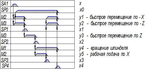 - при срабатывании датчика SP2 движение вдоль оси Z прекращается, включается вращение шпинделя (двигатель М1) и рабочий ход по оси X в прямом направлении;