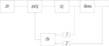 1,2 – датчик измерения толщины; ЗУ – задающее устройство; БУ – Блок управления гидроцилиндром; ПУ – преобразующее устройство