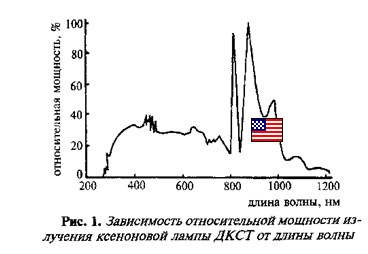 В результате проведенных исследований разработан новый тип терморадиационного оборудования, представляющего собой малогабаритную ультрафиолетовую термическую камеру (УФТК). Важным отличием УФТК от существующего терморадиационного оборудования является то, что в его конструкции применены в качестве источников оптического излучения дуговые ксеноновые трубчатые лампы типа ДКСТ. Достоинства ксеноновых ламп заключаются в том, что они экологически чисты, взрывобезопасны и при горении не вызывают образования озона. В техническом аспекте сильной стороной ксеноновых ламп является безинерционность: у них отсутствует период разгорания, а коэффициент мощности сети близок к единице. Следует особо отметить другое важное преимущество ксеноновых ламп - их спектр излучения включает в себя УФ, видимую и ИК области (рис. 1). Они являются одним из наиболее интенсивных источников УФ, видимого и ИК излучения. Это обусловливает принципиальную возможность применения разработанного оборудования как для осуществления фотохимических процессов, основанных на воздействии на материал УФ излучения, так и для традиционных термических процессов, предусматривающих тепловую обработку тканей ИК излучением.