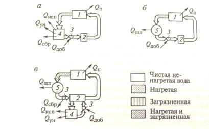 Применяют три основные схемы водооборотных циклов (рис. 3). Вся вода в процессе производства может только нагреваться либо только загрязняться или нагреваться и загрязняться одновременно. В первом случае ее охлаждают в градирне или другом аппарате (рис. 3, а),
