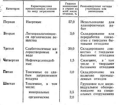 Разработка мероприятий по обезвреживанию и переработке неутилизируемых промышленных отходов привела к необходимости дополнительной классификации их по гигиеническому и технологическому принципам. Классификация по гигиеническому принципу подразделяет промышленные отходы на 6 категорий, которые приведены в таблице 1.
