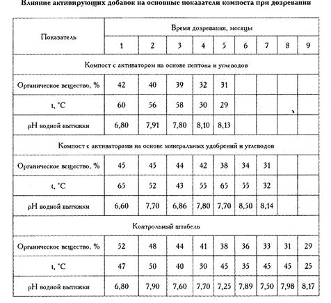 При дозревании в штабелях показали, что добавки, как и предполагалось, влияют лишь на интенсивность протекания процессов. Особенности изменения температуры, рН и органического вещества одинаковы для обеих добавок и контроля, однако скорость протекания различна. Полученные результаты позволяют говорить о том, что внесение активаторов сокращает время созревания компоста в буртах в 2 раза, а сроки пребывания ТКС в биобарабане (за счет сокращения времени выхода на температурный режим) - на 20—38%.