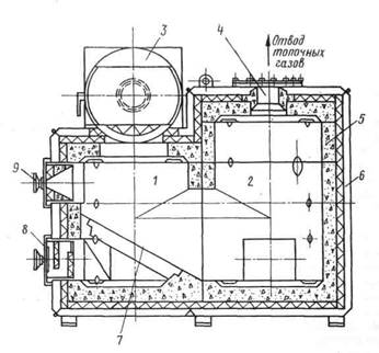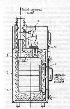 Твердые отходы загружаются через приемный поворотный люк 3 после того, как температура в печи достигнет заданного значения. Колосниковая решетка 7, на которую попадают отходы, имеет шурующее устройство, обеспечивающее более эффективное их сгорание. Поток газов, отходящих от