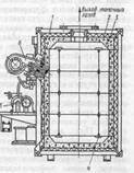 наружные стенки и перекрытия — полые. Воздух, нагнетаемый вентилятором топочного устройства, проходит последовательно перекрытие, стенки и днище, охлаждая наружную поверхность установки. Для предотвращения возможности открытия загрузочной двери при температуре в газоотводном канале выше 70 °С установлен электромагнитный замок. Для усиления процесса горения установлено шурующее устройство. Необходимый для горения воздух кроме сопл подается еще и через топочное устройство.
