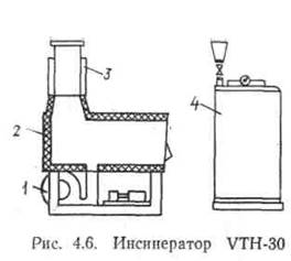 Инсинератор VTH-30 состоит из двух блоков: собственно печи 2 для сжигания отходов и блока 4 подготовки и подачи на сжигание жидких отходов. Корпус печи представляет собой горизонтально расположенный цилиндр, на передней стенке которого расположены форсунки дизельного топлива и жидких отходов, блок зажигания, детектор пламени, люк для удаления золы и осмотра внутренней поверхности печи, а также ряд других приборов и арматуры.