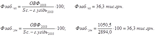 Проведені розрахунки показали, що фондозабезпеченість у 2005 році порівняно із 2003 зменшилось на 23,3 грн. або на 4,2%. Це відбулося за рахунок зменшення середньорічної вартості основних виробничих фондів на 811 тис. грн. або на 3,74%, що в свою чергу спричинило зниження показника фондозабезпеченості на 23,3 грн. Підвищення площі с.-г. угідь на 17,2 га не вплинуло на зміну фондозабезпеченості господарства.