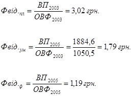 Проведені розрахунки показали, що фондовіддача у 2005 році порівняно із 2003 Збільшилась на 0,04 грн. Це відбулося за рахунок збільшення вартості валової продукції на 454 тис. грн., що призвело до підвищення показника фондовіддачі на 0,02 грн. Також зменшення середньорічної вартості основних виробничих фондів на 811 тис. грн. призвело до зниження фондовіддачі на 0,2грн.
