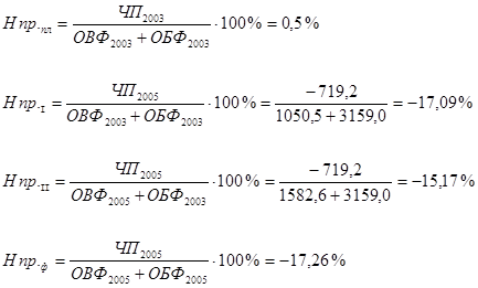 Розрахунки показали, що норма прибутку у 2005 році порівняно із 2003 знизилася на 0,693 пункта відсотка. Це відбулося за рахунок зниження показника чистого прибутку та вартості оборотних фондів на 198 тис. грн. та 811 тис. грн., що у свою чергу призвело до зниження норми прибутку на 0,689% та 0,008% відповідно. Також відбулося збільшення вартості основних виробничих фондів на 2031 тис. грн., в результаті чого норма прибутку підвищилася на 0,004%.