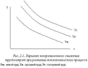 Задача снижения трудозатрат в самом общем виде сводится к некоторому целесообразному видоизменению технологических действий, обеспечивающему экономию затрат. При этом наиболее целесообразным видится снижение затрат живого и прошлого труда на производство единицы продукта, как показано на рис. 2.1. Со временем, причем неограниченно, снижаются и затраты совокупного труда, поэтому такой вариант динамики трудозатрат называют неограниченным.