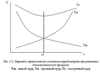 Из рис.2.2. хорошо видно, что замещение живого труда прошлым со временем становится нецелесообразным. Если до момента времени t* данная процедура ведет к снижению совокупных трудозатрат, то после – к возрастанию совокупных трудозатрат. Поэтому вариант динамики трудозатрат на рис.2.2. называют ограниченным по времени. Для него очень важно предвидеть момент наступления экономического предела замещения живого труда прошлым.