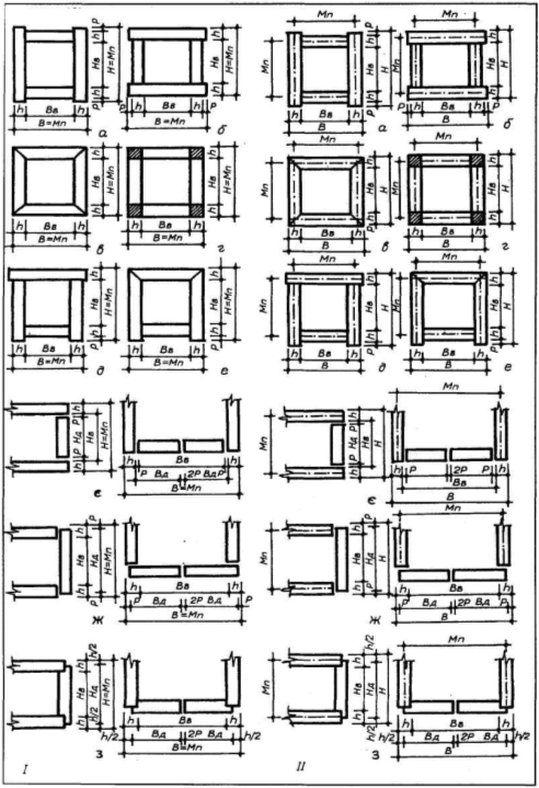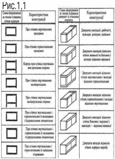 За типами поєднання вертикальних і горизонтальних стінок, а також дверцят зі стінками застосовують основні схеми формування корпусів меблів, які наведені у рис.1,1.