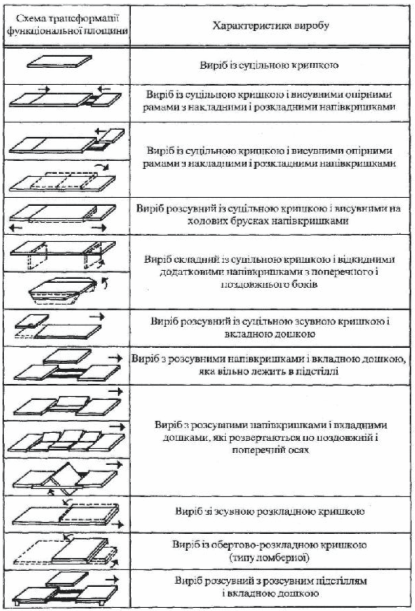 Найпростіші варіанти цієї групи меблів — поєднання комбінованих багатофункціональних виробів з елементами трансформації. Найважливіша характерна ознака конструктивних видів виробів— схеми їх трансформації.