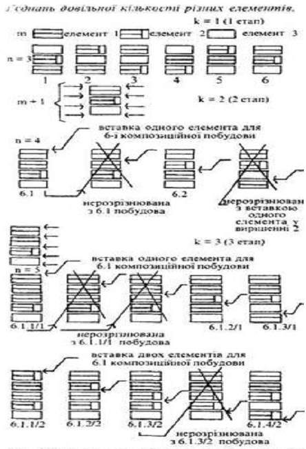 Процедура, властива другому етапу, може повторюватися всього п-т разів, тобто для нашого прикладу 5-3 = 2 рази. На третьому і наступних етапах k вставка маже проводитись уже в m+(k-1) місцях раніше одержаних рішень. При цьому необхідно усунути з одержаних з'єднань композиційно нерозрінювані. Як бачимо з прикладу, подібний емпіричний метод потребуватиме дуже великих затрат часу. Це визначає необхідність ознайомитися з одним із теоретичних положень комбінаторики — перестановки з повтореннями. Перестановки з повтореннями дають змогу розкласти множину А, що складається з п елементів, на суму підмножини таким чинам, щоб кожен із т елементів, дозволених до застосування, входив до А певну кількість разів k[k1, k2 … km]. Кількість композиційно розрізнюваних з'єднань N при цьому визначиться теоремою.
