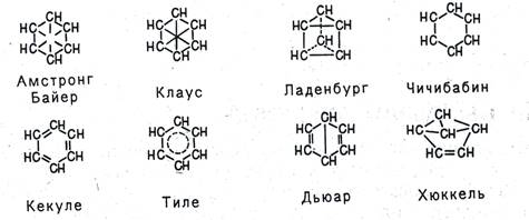 Тиле, усовершенствуя формулу Кекуле, утверждал, что двойные связи в последнем не фиксированы, а постоянно перемещаются-«осциллируют», а Дьюар и Хюккель предложили структурные формулы бензола с двойными связями и малыми циклами.
