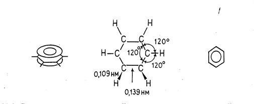 В настоящее время на основании данных многочисленных исследований можно считать твердо установленным, что шесть углеродных и шесть водородных атомов в молекуле бензола находятся в одной плоскости и что облака π-электронов атомов углерода перпендикулярны плоскости молекулы и, следовательно, параллельны друг другу и взаимодействуют между собой. Облако каждого π-электрона перекрывается облаками π-электронов соседних углеродных атомов. Реальная молекула бензола с равномерным распределением π-электронной плотности по всему кольцу может быть представлена в виде плоского шестиугольника, лежащего между двумя торами.