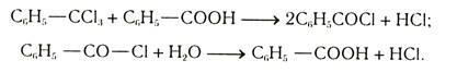 Гидролиз тригалогенопроизводных с галогенами у одного углеродного атома. При хлорировании толуола образуется три вида хлоропроизводных: хлористый бензил (идет для получения бензилового спирта), хлористый бензилиден (для получения бензойного альдегида), бензотрихлорид (перерабатывается в бензойную кислоту и в хлористый бензоил). Непосредственный гидролиз бензотрихлорида идет плохо. Поэтому бензотрихлорид нагреванием с бензойной кислотой превращают в хлористый бензоил, который далее при гидролизе легко дает бензойную кислоту: