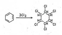 Бензол в отсутствие катализатора не реагирует с бромом и хлором, демонстрируя тем самым устойчивость трех двойных связей в его молекуле к действию электрофильных агентов. В то же время наличие последних подтверждается взаимодействием бензола с хлором при облучении, приводящим к образованию гексахлорциклогексана (гексахлоран):