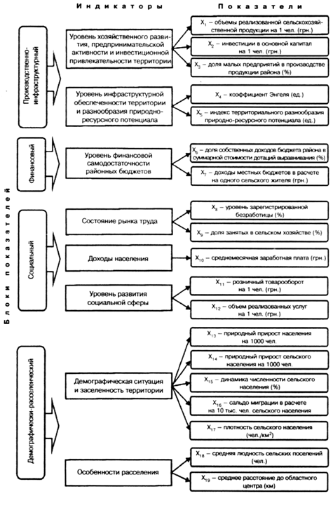 Учитывая системную сущность и многофункциональность сельских территорий, для оценки состояния их депрессивности были отобраны 19 показателей, отражавших производственно-инфраструктурный, финансовый, социальный потенциал, а также особенности демографической ситуации и расселения административных районов Украины (см. рис. 1).