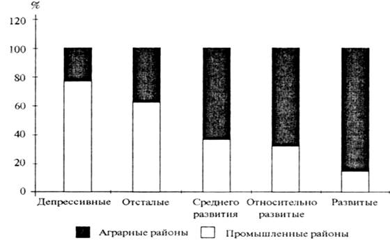 Рис. 2. Доля аграрных и промышленных районов в составе сельских территорий с разным уровнем депрессивности