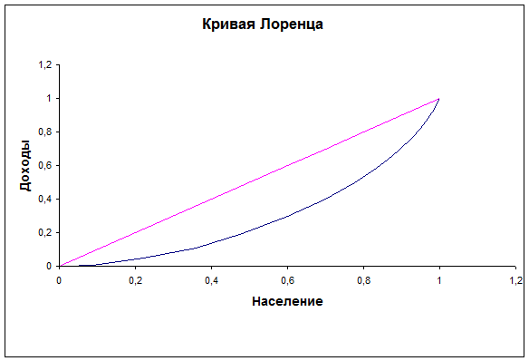 К числу наиболее распространенных индикаторов дифференциации доходов относятся также коэффициент концентрации доходов (индекс Джини) и кривая Лоренца (см. рис1), позволяющие судить о степени удаления от состояния равенства в распределении доходов. Расчет индекса Джини связан с кривой Лоренца.