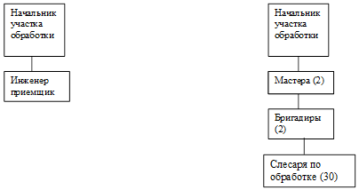 1.4 Между бригадирами и слесарями по обработке. Бригадир осуществляет контроль за деятельностью работников, непосредственно в цехе, принимает участие в обработке материалов, отчитывается перед мастером. Слесаря по обработке выполняют работу в соответствии с производственным заданием, докладывают бригадиру о допущенном браке.