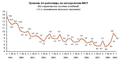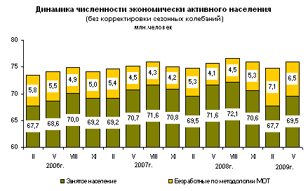 В численности экономически активного населения 67,7 млн человек классифицировались как занятые экономической деятельностью и 6,8 млн человек - как безработные с применением критериев МОТ (не имели работы или доходного занятия, искали работу и были готовы приступить к ней в обследуемую неделю). В январе текущего года общая численность безработных по сопоставимому кругу лиц (в трудоспособном возрасте без студентов, учащихся и пенсионеров по возрасту, выслуге лет или на льготных условиях, отнесенных к безработным) превышала численность безработных, зарегистрированных в органах службы занятости в 2,8 раза.