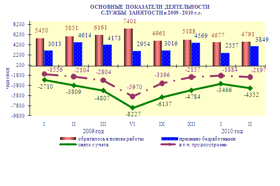 За январь-февраль 2010 года в органы службы занятости области обратилось за предоставлением государственных услуг 13937 человек, из них за содействием в поиске подходящей работы - 9468 человек. Число незанятых граждан среди обратившихся в поиске работы составило 8912 человек, признано безработными 6406 человек.