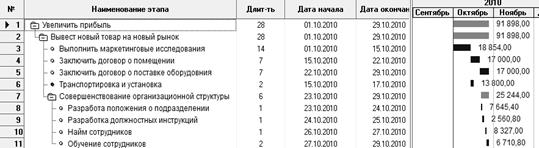 На рисунке 4.1 изображен календарный план, в котором отражены задачи, необходимые для достижения главной цели, начало, окончание и продолжительность осуществления каждой задачи, а также стоимость ресурсов, необходимых для выполнения каждой задачи.