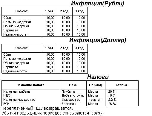 3. Налоги: налог на прибыль – 24%, НДС – 18%, налог на имущество – 2,2%,ЕСН – 26%.