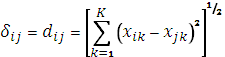 Тоді, згідно звичайній формулі евклідова відстань, міра відмінності двох об’єктів i