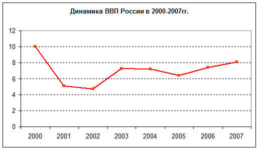 Начиная с 1999 года Россия имеет положительную экономическую динамику, увеличивая в среднем прирост валового внутреннего продукта примерно на 6%. В 2007 году рост и вовсе составил 8,1%, и Россия по данным МВФ заняла 11 место по номинальному объёму ВВП. Росло и благосостояние граждан, и капиталовложение, и приток иностранных инвестиций, стабилизировалась финансовая обстановка, значительно снизилась инфляция.