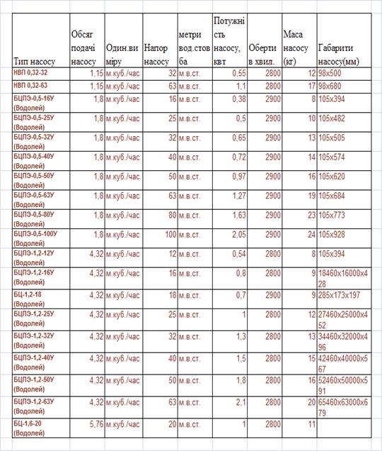 1.2 Основні характеристики побутових скважинних електронасосів для артезіанських колодязів