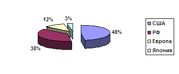Как можно увидеть на диаграмме, рынок космических услуг развит недостаточно. Лидирующие позиции в этой сфере занимают Соединенные Штаты Америки, а Российская Федерация находится на втором месте.