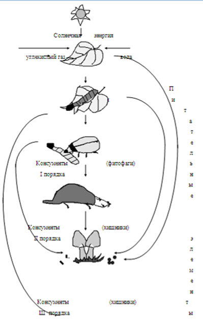растительный субстрат ® фитофаги (включая сапрофагов) ® хищники I порядка ® хищники II порядка ® микроорганизмы ® минерализация.