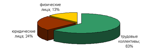 Российский рынок бытового обслуживания во многом своеобразен по отношению к европейскому рынку. Так, в России в сфере бытового обслуживания населения получило распространение не малое частное предпринимательство, не семейный бизнес, как на Западе, а коллективные, кооперативные формы хозяйствования. Владельцами предприятий сферы быта являются: трудовые коллективы – 63%, юридические лица – 23% и физические лица – 13% (см. рисунок 1).