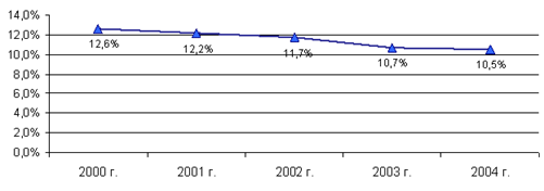 В современных условиях отрасль бытового обслуживания населения развивается неустойчиво, о чем, в частности, свидетельствует следующий факт. Удельный вес бытовых услуг в общем объеме платных услуг населению не имеет тенденции к росту. В 2000 году он составил 12,6%, в 2001 году – 12,2%, в 2002 году – 11,7%, в 2003 году – 10,7%, в 2004 году – 10,5% (см. рисунок 2). В то же время степень износа основных фондов в отрасли «непроизводственные виды бытового обслуживания населения» в целом по России снизилась с 37,8% в 1995 году до 34,5% в 2004 году.