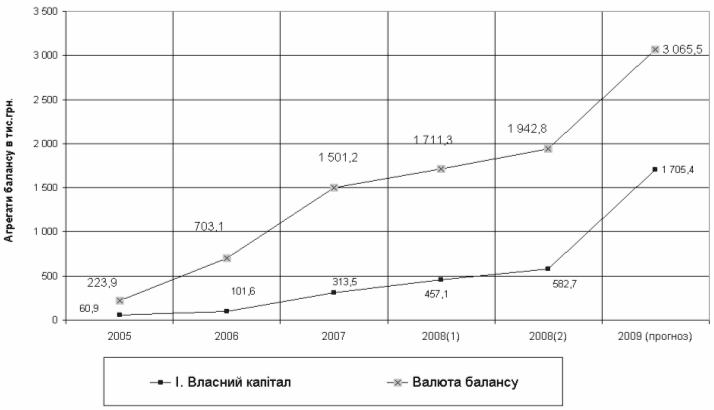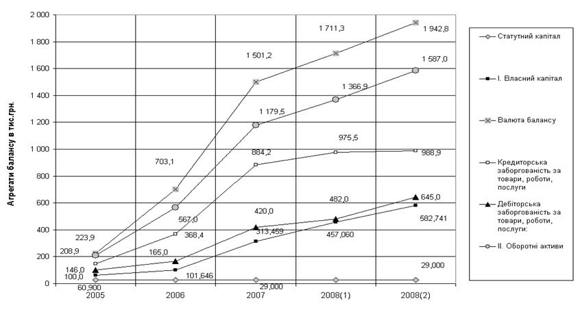 Рис.В.1. Динаміка обсягів валюти і характерних агрегатів активів та пасивів балансу ТОВ „Металоіндустрія Плюс” у 2005 –2008 роках