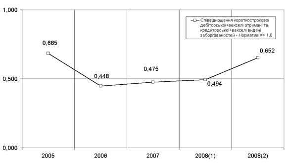 Рис.В.6. Динаміка показника співвідношення дебіторської та кредиторської заборгованостей в балансі ТОВ „Металоіндустрія Плюс” у 2005 –2008 роках