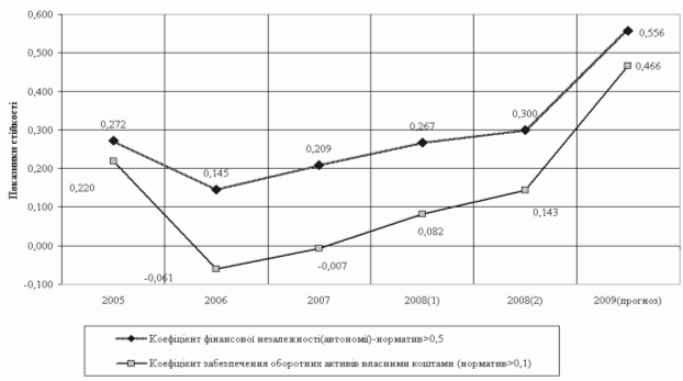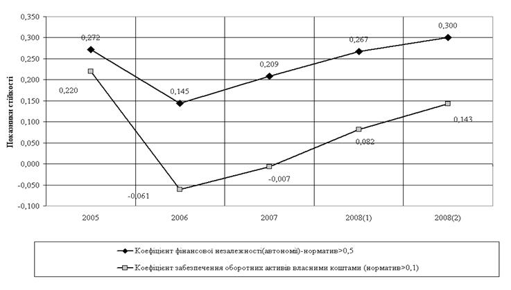 Рис.В.7. Динаміка коефіцієнтів фінансової незалежності (автономії) та забезпечення оборотних коштів в балансі ТОВ „Металоіндустрія Плюс” у 2005 –2008 роках
