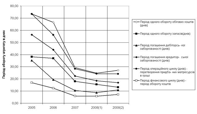 Рис.В.10 Динаміка показників ділової активності (строку оборотності агрегатів активів) в ТОВ „Металоіндустрія Плюс” у 2005 –2008 роках